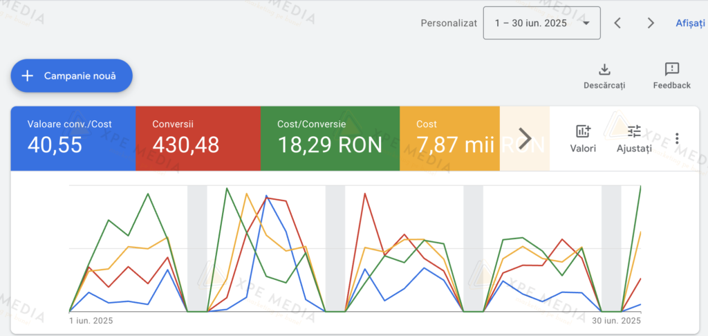 Cu aceste materiale, am lansat 10 campanii Advantage Plus, toate pe public rece și cu setarea maximize conversions. 5 campanii pe targetare broad și 5 pe interese specifice din nișa clientului. O parte dintre ele au fost rulate pe setarea CPA, care folosită correct poate aduce un avantaj important.