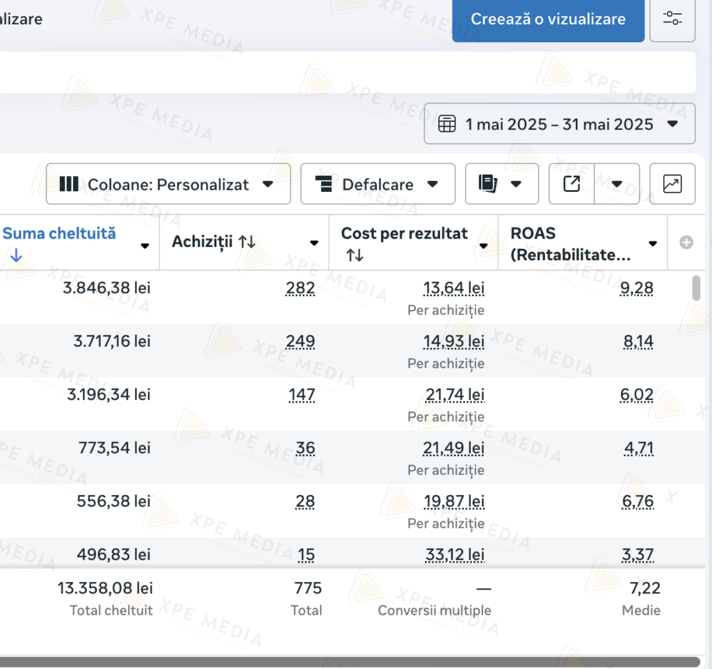Rezultatele? În mai am generat vânzări de 96.387 lei (peste 19.200 de euro), cu un cost de 13.358 lei (aproximativ 2.671 de euro). Asta înseamnă un ROAS de 7,22X și 775 de comenzi într-o singură lună.